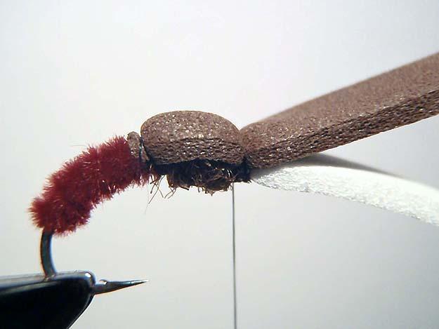 Bruine polycelon achter het haakoog vastzetten en binddraad in 1 omwenteling weer tussen lichaam en thorax brengen.