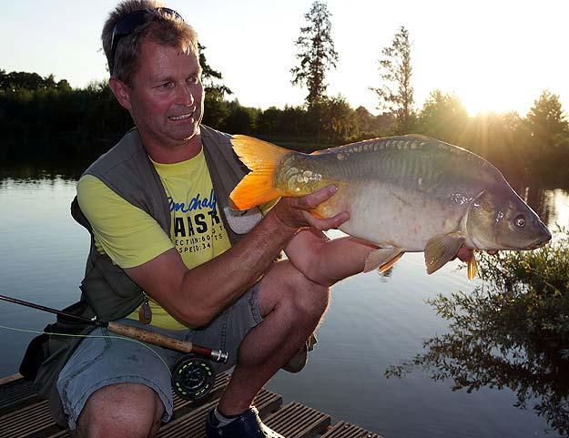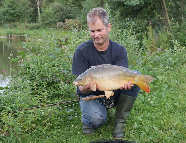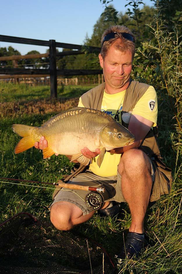 Mooi formaat spiegelkarper voor de vliegenhengel.