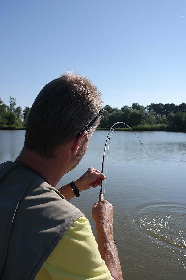 Wel eerst goed oppassen dat je niet te vroeg aanslaat en zeker niet te hard. Dit heb ik uit enthousiasme regelmatig zien gebeuren bij andere vissers. De vissen schrikken dan en gaan er als een raket vandoor.