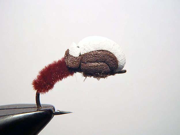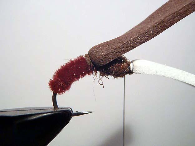 Bruine polycelon achter het haakoog vastzetten en binddraad in 1 omwenteling weer tussen lichaam en thorax brengen.